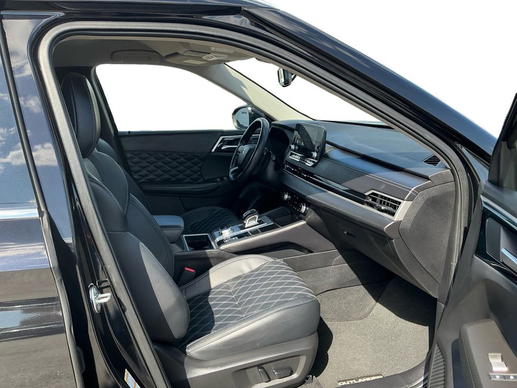 2022 Mitsubishi Outlander SEL Labrador Black Pearl SEL FWD CVT 2.5L 4-Cylinder DOHC 3rd row seats: split-bench, 4-Wheel Disc Brakes, 6 Speakers, ABS brakes, Air Conditioning, Alloy wheels, AM/FM radio: SiriusXM, Android Auto & Apple CarPlay, Auto High-beam Headlights, Auto-dimming Rear-View mirror, Automatic temperature control, Axle Ratio: 5.694, Brake assist, Bumpers: body-color, Driver door bin, Driver vanity mirror, Dual front impact airbags, Dual front side impact airbags, Electronic Stability Control, Emergency communication system: Mitsubishi Connect w/ 24-month trial, Four wheel independent suspension, Front anti-roll bar, Front Bucket Seats, Front Center Armrest w/Storage, Front dual zone A/C, Front fog lights, Front reading lights, Fully automatic headlights, Heated door mirrors, Heated Front Bucket Seats, Heated front seats, Illuminated entry, Knee airbag, Leather Seat Trim, Leather Shift Knob, Leather steering wheel, Low tire pressure warning, Memory seat, Navigation system: Powered by TOMTOM, Occupant sensing airbag, Outside temperature display, Overhead airbag, Overhead console, Panic alarm, Passenger door bin, Passenger vanity mirror, Power door mirrors, Power driver seat, Power Liftgate, Power passenger seat, Power steering, Power windows, Radio data system, Radio: AM/FM 9.0" Navigation w/Smartphone Link, Rain sensing wipers, Rear air conditioning, Rear anti-roll bar, Rear seat center armrest, Rear side impact airbag, Rear window defroster, Rear window wiper, Reclining 3rd row seat, Remote keyless entry, Roof rack: rails only, Security system, Speed control, Speed-Sensitive Wipers, Split folding rear seat, Spoiler, Steering wheel mounted audio controls, Tachometer, Telescoping steering wheel, Tilt steering wheel, Traction control, Trip computer, Turn signal indicator mirrors, Variably intermittent wipers, Wheels: 20" x 8J Two-Tone Alloy.