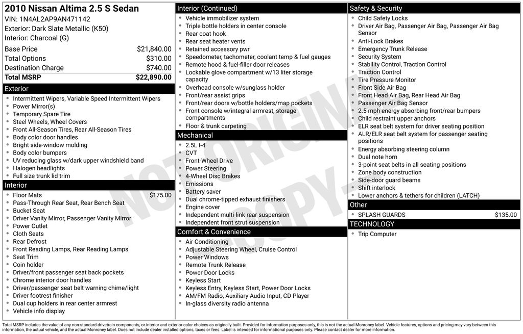 2010 Nissan Altima 2.5 S Dark Slate Metallic 2.5 S FWD CVT with Xtronic 2.5L I4 DOHC 16V CVT with Xtronic, 16" Wheels w/Full-Wheel Bolt-On Covers, 4-Wheel Disc Brakes, 6 Speakers, ABS brakes, Air Conditioning, AM/FM radio, AM/FM/CD Radio, Anti-whiplash front head restraints, Bodyside moldings, Brake assist, Bumpers: body-color, CD player, Cloth Seat Trim, Delay-off headlights, Driver door bin, Driver vanity mirror, Dual front impact airbags, Dual front side impact airbags, Electronic Stability Control, Four wheel independent suspension, Front anti-roll bar, Front Bucket Seats, Front Center Armrest w/Storage, Front reading lights, Illuminated entry, Low tire pressure warning, Multi-Adjustable Reclining Front Bucket Seats, Occupant sensing airbag, Outside temperature display, Overhead airbag, Overhead console, Panic alarm, Passenger door bin, Passenger vanity mirror, Power door mirrors, Power steering, Power windows, Rear anti-roll bar, Rear reading lights, Rear seat center armrest, Rear window defroster, Remote keyless entry, Security system, Speed control, Speed-sensing steering, Speed-Sensitive Wipers, Split folding rear seat, Tachometer, Telescoping steering wheel, Tilt steering wheel, Traction control, Trip computer, Variably intermittent wipers, CVT with Xtronic.