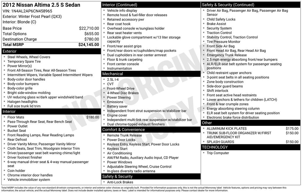 2012 Nissan Altima 2.5 S Winter Frost Pearl 2.5 S FWD CVT with Xtronic 2.5L I4 DOHC 16V CVT with Xtronic, 16" Wheels w/Full-Wheel Bolt-On Covers, 4-Wheel Disc Brakes, 6 Speakers, ABS brakes, Air Conditioning, AM/FM radio, AM/FM/CD Radio, Anti-whiplash front head restraints, Bodyside moldings, Brake assist, Bumpers: body-color, CD player, Delay-off headlights, Driver door bin, Driver vanity mirror, Dual front impact airbags, Dual front side impact airbags, Electronic Stability Control, Four wheel independent suspension, Front anti-roll bar, Front Bucket Seats, Front Center Armrest w/Storage, Front reading lights, Illuminated entry, Low tire pressure warning, Multi-Adjustable Reclining Front Bucket Seats, Occupant sensing airbag, Outside temperature display, Overhead airbag, Overhead console, Panic alarm, Passenger door bin, Passenger vanity mirror, Power door mirrors, Power steering, Power windows, Rear anti-roll bar, Rear reading lights, Rear seat center armrest, Rear window defroster, Remote keyless entry, Security system, Speed control, Speed-sensing steering, Speed-Sensitive Wipers, Split folding rear seat, Tachometer, Telescoping steering wheel, Tilt steering wheel, Traction control, Trip computer, Variably intermittent wipers, Velour Seat Trim, CVT with Xtronic.