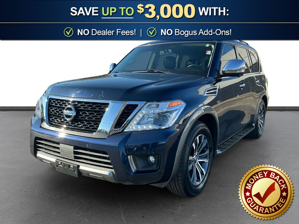 2020 Nissan Armada SL Hermosa Blue Pearl SL RWD 7-Speed Automatic 5.6L V8 13 Speakers, 20" Painted Alloy Wheels, 3rd Row Carpeted Floor Mats - Bench Seat, 3rd row seats: split-bench, 4-Wheel Disc Brakes, ABS brakes, Air Conditioning, Alloy wheels, AM/FM radio: SiriusXM, Anti-whiplash front head restraints, Auto tilt-away steering wheel, Auto-dimming door mirrors, Auto-dimming Rear-View mirror, Auto-leveling suspension, Automatic temperature control, Axle Ratio: 2.94, Blind Spot Warning, Brake assist, Bumpers: body-color, CD player, Delay-off headlights, Driver door bin, Driver vanity mirror, Dual front impact airbags, Dual front side impact airbags, DVD-Audio, Electronic Stability Control, Emergency communication system: NissanConnect Services, Exterior Parking Camera Rear, Four wheel independent suspension, Front anti-roll bar, Front Bucket Seats, Front Center Armrest, Front dual zone A/C, Front fog lights, Front reading lights, Fully automatic headlights, Garage door transmitter: HomeLink, Heated door mirrors, Heated Front Bucket Seats w/Power Driver's Memory, Heated front seats, Illuminated entry, Intelligent Back-Up Intervention (I-BI), Intelligent Distance Control (I-DC), Leather Shift Knob, Leather-Appointed Seat Trim, Low tire pressure warning, Memory seat, Navigation System, Occupant sensing airbag, Outside temperature display, Overhead airbag, Overhead console, Panic alarm, Passenger door bin, Passenger vanity mirror, Power door mirrors, Power driver seat, Power Liftgate, Power passenger seat, Power Sliding Moonroof w/Front Tilt & Rear Slide, Power steering, Power windows, Premium Package, Radio data system, Radio: AM/FM/SXM/CD/MP3/HD, Rain sensing wipers, Rear air conditioning, Rear anti-roll bar, Rear Cross Traffic Alert (RCTA), Rear reading lights, Rear seat center armrest, Rear window defroster, Rear window wiper, Reclining 3rd row seat, Remote keyless entry, Security system, Speed control, Speed-sensing steering, Speed-Sensitive Wipers, Split folding rear seat, Spoiler, Steering wheel memory, Steering wheel mounted audio controls, Tachometer, Telescoping steering wheel, Tilt steering wheel, Traction control, Trip computer, Turn signal indicator mirrors, Variably intermittent wipers, Voltmeter.