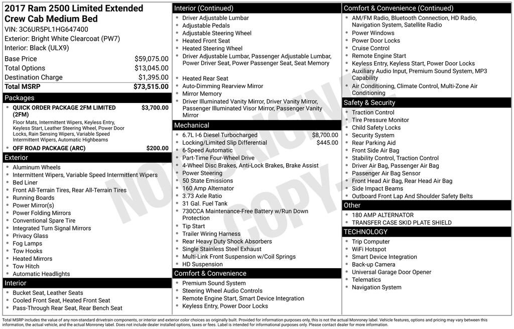 Recent Arrival! **CARFAX 1 OWNER**, 10 Speakers, 115V Auxiliary Power Outlet, 180 Amp Alternator, 4 Adjustable Cargo Tie-Down Hooks, 4-Wheel Disc Brakes, ABS brakes, Adjustable pedals, Air Conditioning, Alloy wheels, AM/FM radio: SiriusXM, Anti-Spin Differential Rear Axle, Audio memory, Auto High Beam Headlamp Control, Auto-dimming door mirrors, Auto-dimming Rear-View mirror, Automatic temperature control, Bed Cargo Divider/Extender, Body Color Fender Flares, Brake assist, Bucket Seats, Center Hub, Chrome Belt Moldings, Chrome Exterior Mirrors, Chrome Grille w/RAM Letters, Chrome RAM Tailgate Nameplate, Compass, Delay-off headlights, Driver door bin, Driver vanity mirror, Dual front impact airbags, Dual front side impact airbags, Electronic Stability Control, Electronically Controlled Throttle, Emergency communication system: Uconnect Access, Exterior Mirrors Courtesy Lamps, Exterior Mirrors w/Heating Element, Exterior Mirrors w/Memory, Exterior Mirrors w/Supplemental Signals, Front anti-roll bar, Front Bucket Seats, Front Center Armrest w/Storage, Front dual zone A/C, Front fog lights, Front Heavy Duty Shock Absorbers, Front reading lights, Fully automatic headlights, Garage door transmitter, Genuine wood console insert, Genuine wood dashboard insert, Genuine wood door panel insert, Heated door mirrors, Heated Front Seats, Heated front seats, Heated rear seats, Heated Second Row Seats, Heated Steering Wheel, Heated steering wheel, Hemi Badge, High Back Seats, Hill Descent Control, Illuminated entry, Instrument Cluster w/Display Screen, Keyless Enter-N-Go, Laramie Limited Leather Bucket Seats, Leather steering wheel, Leather Wrapped Grab Handle, LED Bed Lighting, Limited Chrome Bodyside Molding, Limited Decor Group, Limited Tailgate Applique 4x4, Locking Tailgate, Low tire pressure warning, Luxury Door Trim Panel, Luxury Front & Rear Floor Mats, Memory seat, Navigation System, Next Generation Engine Controller, Occupant sensing airbag, Off Road Package, Offroad Decal, Outside temperature display, Overhead airbag, Overhead console, Painted Front Bumper, Painted Rear Bumper, Panic alarm, ParkView Rear Back-Up Camera, Passenger door bin, Passenger vanity mirror, Pedal memory, Power 10-Way Memory Driver & 6-Way Passenger Seats, Power door mirrors, Power driver seat, Power Lumbar Adjust, Power passenger seat, Power steering, Power windows, Power-Folding Mirrors, Premium Filigree Leather Seats, Quick Order Package 2FM Limited, Radio data system, Radio: Uconnect 3C Nav w/8.4 Display, Rain Sensitive Windshield Wipers, RAM 2500 Badge, RamBox Cargo Management System, Rear 60/40 Split Folding Seat, Rear Heavy Duty Shock Absorbers, Rear seat center armrest, Rear step bumper, Remote keyless entry, Remote Proximity Keyless Entry, Security system, Speed control, Split folding rear seat, Steering Wheel Mounted Audio Controls, Steering wheel mounted audio controls, Tachometer, Tilt steering wheel, Tip Start, Traction control, Trip computer, Turn signal indicator mirrors, Variably intermittent wipers, Vendor Painted Cargo Box Tracking, Ventilated Front Seats, Ventilated front seats, Voltmeter, Wheel to Wheel Side Steps, Wheels: 18 x 8.0 Aluminum w/Walnut Pockets, Wheels: 20 x 8.0 Satin Carbon w/Chrome Insert, Wood/Leather Wrapped Steering Wheel.