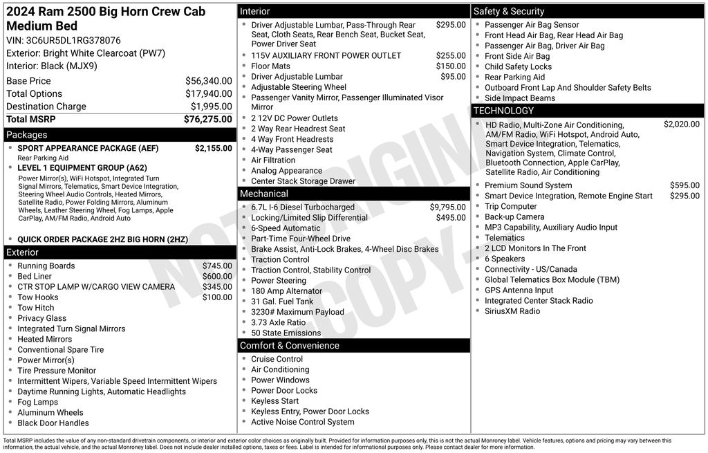 2024 Ram 2500 Big Horn Bright White Clearcoat Big Horn 4WD 6-Speed Automatic Cummins 6.7L I6 Turbodiesel 115V Auxiliary Front Power Outlet, 12" Touchscreen Display, 2 Way Rear Headrest Seat, 2nd Row In Floor Storage Bins, 3.73 Axle Ratio, 4 Way Front Headrests, 4-Wheel Disc Brakes, 40/20/40 Split Bench Seat, 400W Inverter, 4G LTE Wi-Fi Hot Spot, 6 Speakers, 8.4" Touchscreen Display, 9 Alpine Speakers w/Subwoofer, ABS brakes, Active Noise Control System, Air Conditioning, Air Conditioning ATC w/Dual Zone Control, Alexa Built-In, All R1 High Radios, All Radio Equipped Vehicles, Anti-Spin Differential Rear Axle, Apple CarPlay, Auto Power-Folding Mirrors, Big Horn IP Badge, Black Exterior Mirrors, Black Interior Accents, Bluetooth Handsfree Phone & Audio, Body Color Door Handles, Body Color Grille Surround, Brake assist, Bumpers: chrome, Center Hub, Center Stack Storage Drawer, Chrome Flat Wheel-to-Wheel Side Steps, Cloth 40/20/40 Bench Seat, Compass, Connected Travel & Traffic Services, Connectivity - US/Canada, CTR Stop Lamp w/Cargo View Camera, Delay-off headlights, Disassociated Touchscreen Display, Driver door bin, Dual front impact airbags, Dual front side impact airbags, Dual Glove Boxes, Electronic Stability Control, Electronically Controlled Throttle, Emergency communication system: SiriusXM Guardian, Exterior 115V AC Outlet, Exterior Mirrors Courtesy Lamps, Exterior Mirrors w/Heating Element, Exterior Mirrors w/Supplemental Signals, Foam Bottle Insert (Door Trim Panel), Footwell Courtesy Lamp, For Details, Visit DriveUconnect.com, For More Info, Call 800-643-2112, Forward & Reverse Utility Lights, Front anti-roll bar, Front Armrest w/Cupholders, Front Center Armrest w/Storage, Front Center Seat Cushion Storage, Front Fog Lamps, Front License Plate Bracket, Front reading lights, Front Seat Back Map Pockets, Fully automatic headlights, Global Telematics Box Module (TBM), Glove Box Lamp, Google Android Auto, GPS Antenna Input, GPS Navigation, HD Radio, Heated door mirrors, Illuminated entry, Integrated Center Stack Radio, Integrated Voice Command w/Bluetooth, Leather Wrapped Steering Wheel, Level 1 Equipment Group, Locking Lower Glove Box, Low tire pressure warning, Manual Adjust 4-Way Driver Seat, Manual Adjust 4-Way Front Passenger Seat, Mirror Running Lights, MOPAR Front & Rear Rubber Floor Mats, MOPAR Spray In Bedliner, Occupant sensing airbag, Off-Road Information Pages, Outside temperature display, Overhead airbag, Overhead console, Painted Front Bumper, Painted Rear Bumper, Panic alarm, ParkSense Front/Rear Park Assist System, ParkView Rear Back-Up Camera, Passenger door bin, Passenger vanity mirror, Power 2-Way Driver Lumbar Adjust, Power Adjust 8-Way Driver Seat, Power Adjust Mirrors, Power Adjustable Convex Aux Mirrors, Power door mirrors, Power Heated Fold Telescope Mirrors, Power steering, Power Telescoping Mirrors, Power windows, Premium Cloth 40/20/40 Bench Seat (DISC), Quick Order Package 2HZ Big Horn, Radio data system, Radio: Uconnect 3 w/5" Display, Radio: Uconnect 5 Nav w/12.0" Display, Radio: Uconnect 5 W w/8.4" Display, Rear 60/40 Folding Seat, Rear anti-roll bar, Rear Dome w/On/Off Switch Lamp, Rear Folding Seat, Rear seat center armrest, Rear step bumper, Remote keyless entry, Remote Start System, Remote USB Port - Charge Only, Selectable Tire Fill Alert, SiriusXM Radio Service, SiriusXM Satellite Radio, SiriusXM w/360L, Speed control, Sport Appearance Package, Sport Decal, Steering Wheel Mounted Audio Controls, Storage Tray, Tachometer, Tilt steering wheel, Tip Start, Tow Hooks, Traction control, Trailer Tow Pages, Trip computer, Turn signal indicator mirrors, Variably intermittent wipers, Voltmeter, Wheels: 18" x 8.0" Polished Aluminum, Wheels: 18" x 8.0" Steel Chrome Clad.
