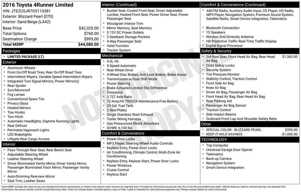 2016 Toyota 4Runner White RWD 5-Speed Automatic with Overdrive 4.0L V6 SMPI DOHC 3.727 Axle Ratio, 4-Wheel Disc Brakes, ABS brakes, Air Conditioning, Alloy wheels, AM/FM radio: SiriusXM, Anti-whiplash front head restraints, Brake assist, Bumpers: body-color, CD player, Driver door bin, Driver vanity mirror, Dual front impact airbags, Dual front side impact airbags, Electronic Stability Control, Exterior Parking Camera Rear, Front anti-roll bar, Front Bucket Seats, Front Center Armrest, Front fog lights, Front reading lights, Front wheel independent suspension, Heated door mirrors, Illuminated entry, Knee airbag, Leather Shift Knob, Low tire pressure warning, Occupant sensing airbag, Outside temperature display, Overhead airbag, Overhead console, Panic alarm, Passenger door bin, Passenger vanity mirror, Power door mirrors, Power driver seat, Power steering, Power windows, Rear anti-roll bar, Rear seat center armrest, Rear window defroster, Rear window wiper, Remote keyless entry, Roof rack: rails only, Speed control, Speed-sensing steering, Split folding rear seat, Spoiler, Steering wheel mounted audio controls, Tachometer, Telescoping steering wheel, Tilt steering wheel, Traction control, Trip computer, Variably intermittent wipers, Voltmeter.