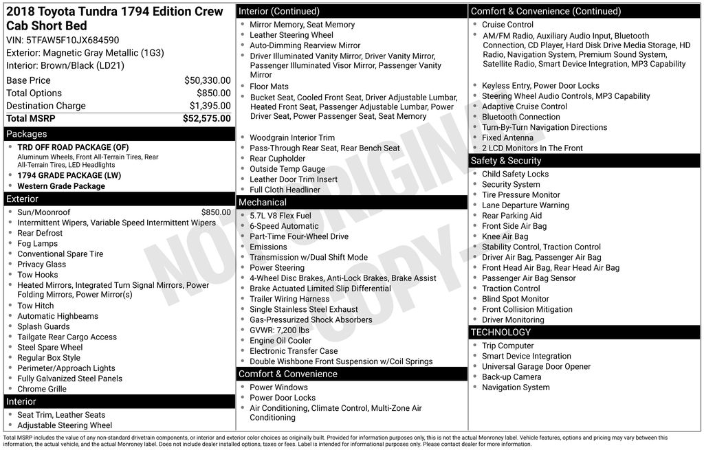2018 Toyota Tundra Gray 4WD 6-Speed Automatic Electronic with Overdrive 5.7L 8-Cylinder SMPI DOHC 4WD, 4-Wheel Disc Brakes, 4.30 Axle Ratio, ABS brakes, Air Conditioning, AM/FM radio: SiriusXM, Auto High-beam Headlights, Brake assist, CD player, Compass, Delay-off headlights, Driver door bin, Driver vanity mirror, Dual front impact airbags, Dual front side impact airbags, Electronic Stability Control, Exterior Parking Camera Rear, Front anti-roll bar, Front Bucket Seats, Front fog lights, Front reading lights, Front wheel independent suspension, Fully automatic headlights, Heated door mirrors, Illuminated entry, Knee airbag, Low tire pressure warning, Occupant sensing airbag, Outside temperature display, Overhead airbag, Overhead console, Panic alarm, Passenger door bin, Passenger vanity mirror, Power door mirrors, Power steering, Power windows, Rear reading lights, Rear seat center armrest, Rear step bumper, Rear window defroster, Remote keyless entry, Speed control, Speed-sensing steering, Split folding rear seat, Tachometer, Tilt steering wheel, Traction control, Trip computer, Variably intermittent wipers, Voltmeter, 4WD.