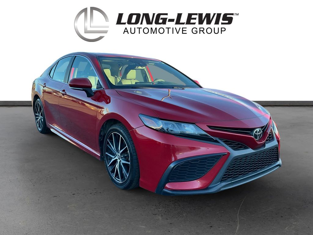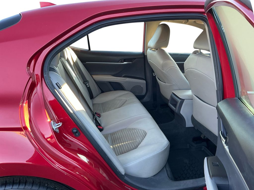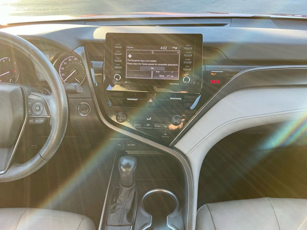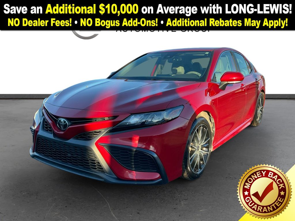 2021 Toyota Camry Red FWD 8-Speed Automatic 2.5L I4 DOHC 16V Cloth, 4-Wheel Disc Brakes, 6 Speakers, ABS brakes, Air Conditioning, Alloy wheels, AM/FM radio: SiriusXM, Apple CarPlay/Android Auto, Auto High-beam Headlights, Automatic temperature control, Brake assist, Bumpers: body-color, Delay-off headlights, Driver door bin, Driver vanity mirror, Dual front impact airbags, Dual front side impact airbags, Electronic Stability Control, Emergency communication system: Safety Connect with 1-year trial, Exterior Parking Camera Rear, Fabric Seat Trim w/Sport SofTex, Four wheel independent suspension, Front anti-roll bar, Front Bucket Seats, Front Center Armrest, Front reading lights, Fully automatic headlights, Illuminated entry, Knee airbag, Low tire pressure warning, Occupant sensing airbag, Outside temperature display, Overhead airbag, Overhead console, Panic alarm, Passenger door bin, Passenger vanity mirror, Power door mirrors, Power driver seat, Power steering, Power windows, Radio data system, Radio: AM/FM Audio System, Rear anti-roll bar, Rear seat center armrest, Rear side impact airbag, Rear window defroster, Remote keyless entry, Security system, Speed control, Speed-sensing steering, Split folding rear seat, Spoiler, Steering wheel mounted audio controls, Tachometer, Telescoping steering wheel, Tilt steering wheel, Traction control, Trip computer, Variably intermittent wipers, Cloth.