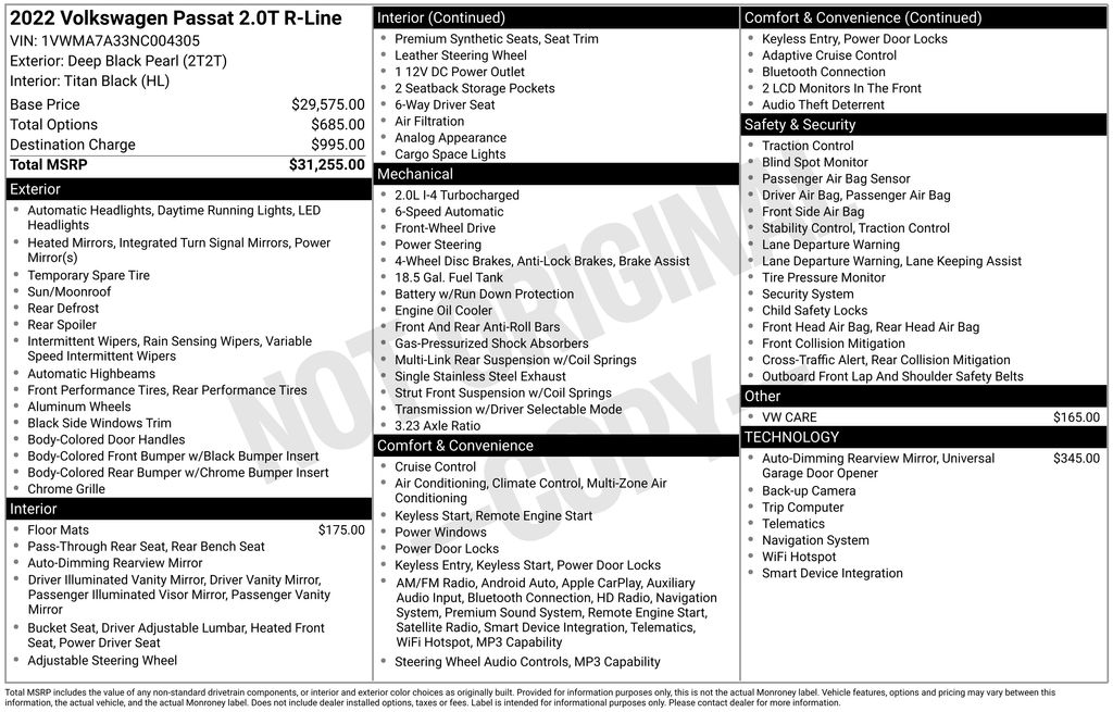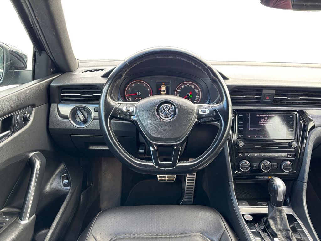 2022 Volkswagen Passat 2.0T R-Line Deep Black Pearl Metallic 2.0T R-Line FWD 6-Speed Automatic with Tiptronic 2.0L I4 TSI Turbocharged Titan Black Premium Synthetic, 4-Wheel Disc Brakes, 9 Speakers, ABS brakes, Active Blind Spot Monitor, Air Conditioning, Alloy wheels, AM/FM radio: SiriusXM, Auto High-beam Headlights, Auto-dimming Rear-View mirror, Automatic temperature control, Brake assist, Bumpers: body-color, Delay-off headlights, Driver door bin, Driver vanity mirror, Dual front impact airbags, Dual front side impact airbags, Electronic Stability Control, Emergency communication system, Exterior Parking Camera Rear, Four wheel independent suspension, Frameless Auto-Dimming Rearview Mirror, Front anti-roll bar, Front Bucket Seats, Front Center Armrest, Front dual zone A/C, Front reading lights, Fully automatic headlights, Heated door mirrors, Heated Front Comfort Seats, Heated front seats, Illuminated entry, Leather Shift Knob, Leather steering wheel, Low tire pressure warning, MojoMats w/Logo Carpeted Mats (Set of 4) (DISC), Navigation System, Occupant sensing airbag, Outside temperature display, Overhead airbag, Overhead console, Panic alarm, Passenger door bin, Passenger vanity mirror, Perforated V-Tex Leatherette Seating Surfaces, Power door mirrors, Power driver seat, Power moonroof, Power steering, Power windows, Radio data system, Radio: Discover Media w/Touchscreen Navigation, Rain sensing wipers, Rear anti-roll bar, Rear reading lights, Rear seat center armrest, Rear window defroster, Remote keyless entry, Security system, Speed control, Speed-sensing steering, Split folding rear seat, Spoiler, Steering wheel mounted audio controls, Tachometer, Telescoping steering wheel, Tilt steering wheel, Traction control, Trip computer, Turn signal indicator mirrors, Variably intermittent wipers, VW Care, Wheels: 19" x 8J 5-Spoke 2-Tone Machined Alloy, Titan Black Premium Synthetic.