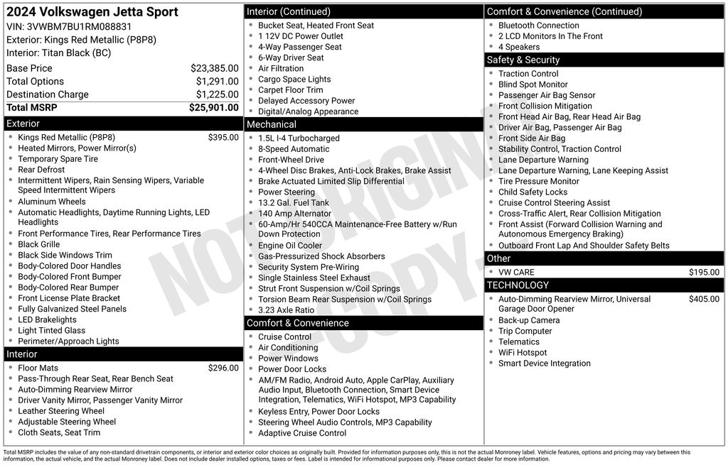 2024 Volkswagen Jetta 1.5T Sport Kings Red Metallic 1.5T Sport FWD 8-Speed Automatic with Tiptronic 1.5L I-4 DI DOHC Turbocharged Black Cloth, 4 Speakers, 4-Wheel Disc Brakes, ABS brakes, Active Blind Spot Monitor, Air Conditioning, Alloy wheels, Auto-dimming Rear-View mirror, Auto-Dimming Rearview Mirror w/HomeLink Connect, Brake assist, Bumpers: body-color, Cloth Seat Trim, Delay-off headlights, Driver door bin, Driver vanity mirror, Dual front impact airbags, Dual front side impact airbags, Electronic Stability Control, Emergency communication system: VW Car-Net Safe & Secure 5-year, Exterior Parking Camera Rear, Front anti-roll bar, Front Bucket Seats, Front Center Armrest, Front wheel independent suspension, Fully automatic headlights, Heated door mirrors, Heated Front Seats, Heated front seats, Heavy Duty Trunk Liner w/VW CarGo Blocks, Illuminated entry, Leather Shift Knob, Leather steering wheel, Low tire pressure warning, Occupant sensing airbag, Outside temperature display, Overhead airbag, Overhead console, Panic alarm, Passenger door bin, Passenger vanity mirror, Power door mirrors, Power steering, Power windows, Radio data system, Radio: MIB3 Composition Color w/6.5" Touchscreen, Rain sensing wipers, Rear anti-roll bar, Rear reading lights, Rear seat center armrest, Rear window defroster, Remote keyless entry, Rubber Monster Mats Kit (Set of 4), Speed control, Speed-sensing steering, Split folding rear seat, Steering wheel mounted audio controls, Tachometer, Telescoping steering wheel, Tilt steering wheel, Traction control, Trip computer, Variably intermittent wipers, VW Care, Wheels: 17" 2-Tone Machined Alloy, Black Cloth.